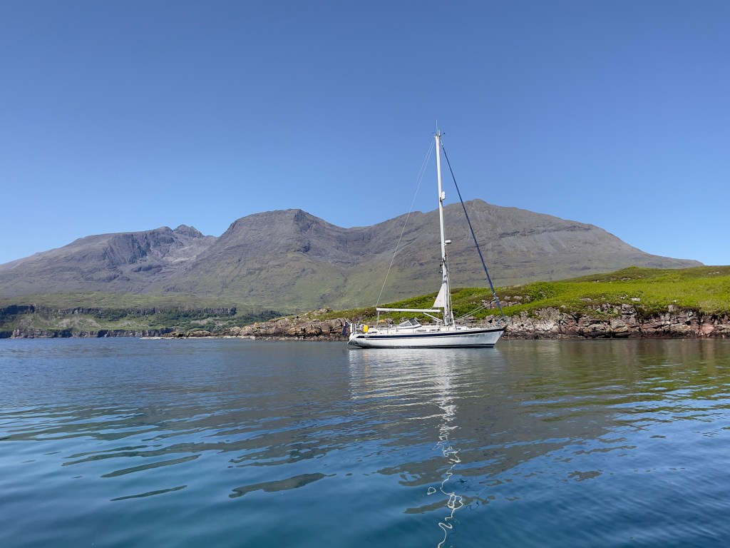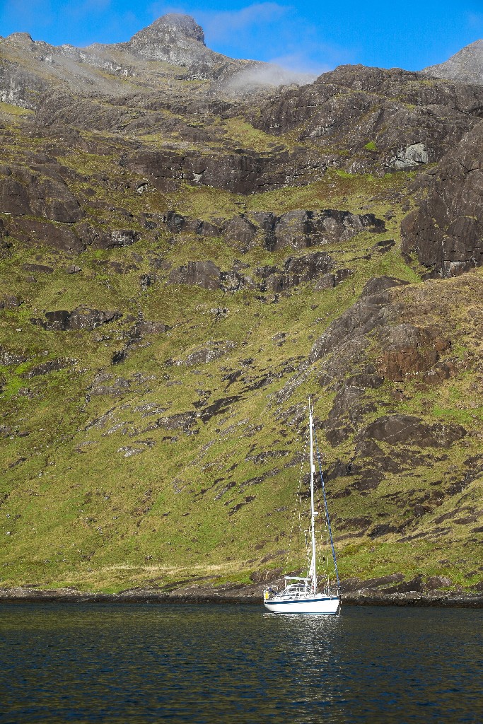 Despite it being absolutely flat calm at Soay, as we came towards Loch Scavaig, the wind filled in to a good Northerly F5, and only became a little calmer within the ‘sheltered’ anchorage under the Cuillin – the wind whistled down the hills from each side, and the four yachts anchored there swung every which way, until morning! I was pleased to deploy our new 11kg Ultra anchor ring, to assist with reducing our swinging room, and to increase the holding of our 25kg Delta anchor.