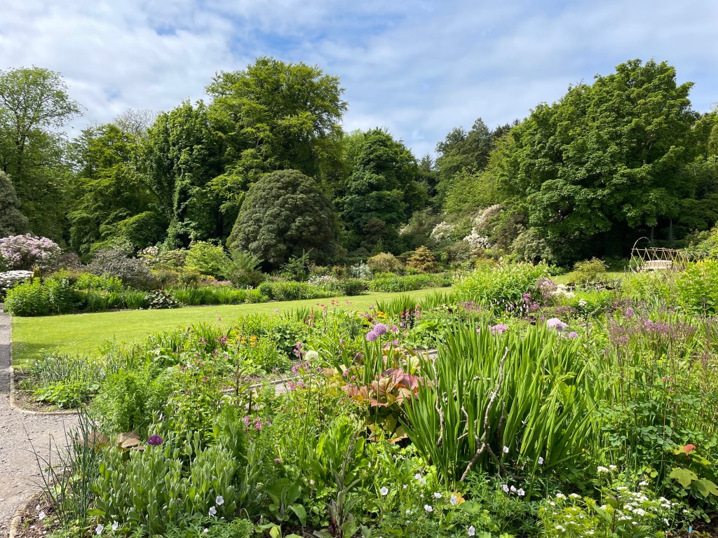The next day, Saturday 27th May, was to be devoted to exploring Gigha more thoroughly; our last visit in 2022 (our first) was curtailed by the wind filling in from the East overnight, making it rather bouncy and encouraging an early departure! We enjoyed a walk through the village, and through the Achamore House Gardens and woodland, on towards the south end of the island, checking out the airstrip for a possible visit by air sometime, and returning via the hill in the Gardens for the view over the Sound of Jura, which was all delightful; we nipped back to the boat for our showering kit, and were pleased to test out the new showers at the campsite (at a reasonable price, on an honesty basis), before our booked lunch stop at the excellent Boathouse restaurant, at the top of the landing pontoon. They are doing a roaring trade, perhaps partly as the Gigha Hotel was sadly no longer trading, its last tenants recently having gone into administration; hopefully this will be reopened before long.