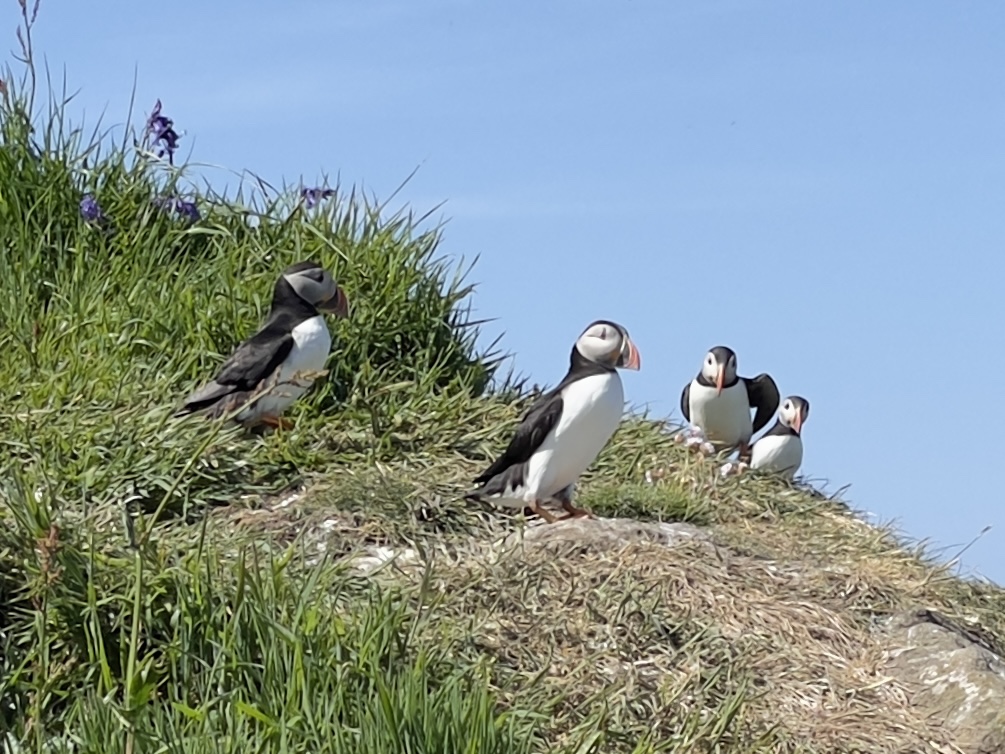 We had an early start the next morning, to visit Lunga in the Treshnish Islands whilst the weather remained calm, and before the tourist boats; we arrived, on a sunny and flat calm morning, to have the whole anchorage to ourselves, though two other yachts joined us in due course. We enjoyed our new electric outboard here, the puffins and razorbills swimming on the sea allowing us to stealthily approach within a couple of metres. On scrambling ashore – a bit of a challenge over the slippery rocks – we found thousands of nesting puffins, which again seemed quite content to allow us to be within a couple of metres. To start with, the crews of the three yachts present had the island to ourselves, but in due course, the tripper boats arrived, discharging their passengers via a clever pontoon arrangement that they drove hard onto the rocky foreshore, so that the inshore end reached over the high water mark.