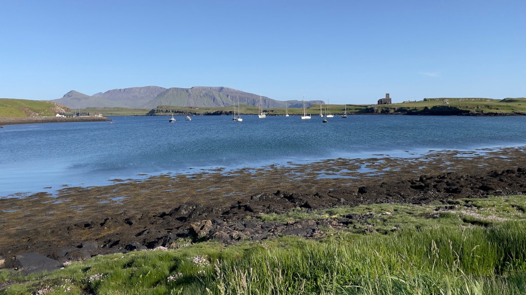 After a visit to the Coop for ‘messages’ (Scottish term for victuals /comestibles or “food shopping”) – timing the visit such that our wine arrived at the cashier’s end of the conveyor at exactly 10:00am when it became legal to sell alcohol – we set off towards the West end of the island of Coll, to explore into Loch Breachacha, the bay with two castles.