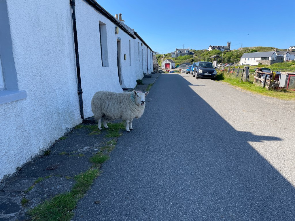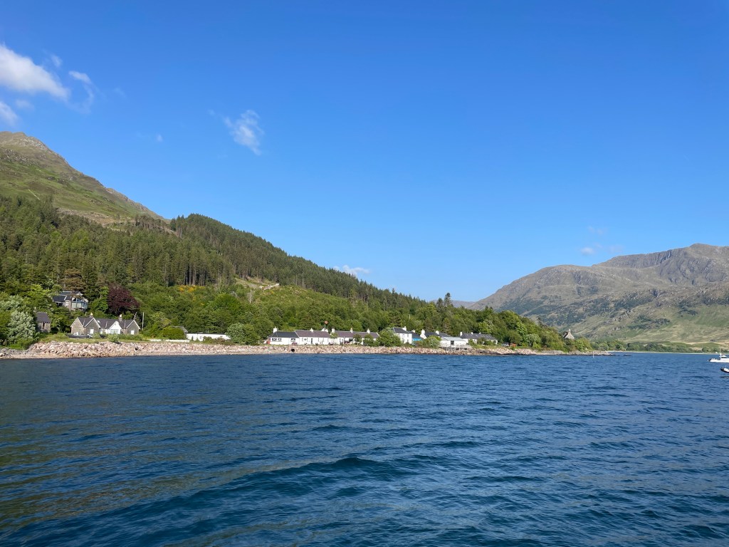 In the morning, we explored briefly into Loch Hourn, finding another stunning anchorage to visit on another occasion, and crossed the Sound of Sleat for a full Scottish breakfast at Aunt Christine’s house next to Armadale pier; we were assured by a resident yachtsman that it was OK to pick up one of three moorings, contributions welcome, and the old pier has a floating pontoon for dinghies (and an honesty box and BACS details for contributions). We managed a re-supply of various stores from the fabulous new community store at Armadale – we always found that the community stores in even remote places such as Eigg hold an astonishing choice of exotic ingredients, as good as Waitrose! – and cast off at lunchtime to sail back across the Sound of Sleat and up Loch Nevis, to visit Inverie – which, with its famous Forge Inn, has been near the top of my list of places to visit for a long time. The Forge had been bought by the community, and unfortunately was closed whilst they were undertaking a complete refurbishment, so we will have to return again! We were interested to see that there were quite a few cars here, including a Royal Mail postie van – and we walked the full one mile length of the one available road, from one end to the other! It’s a 15 mile or so hike over the hills from the nearest road, to reach Inverie, unless you arrive by sea.