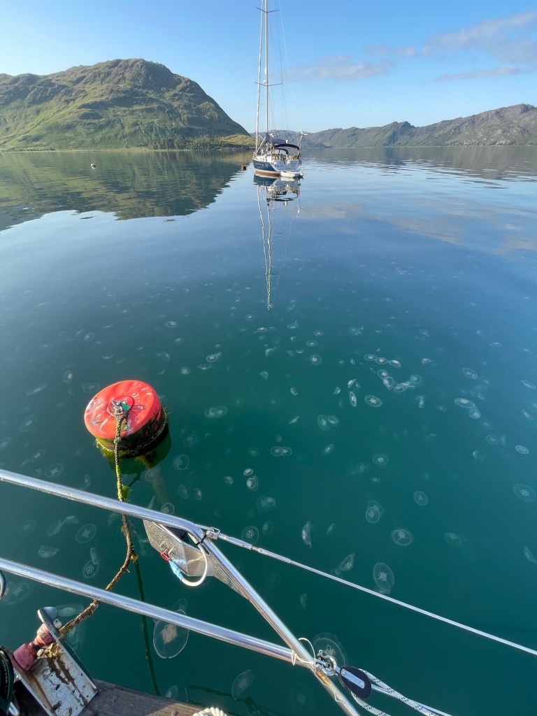In the morning, we were astonished to see the sea was thick with Moon Jellyfish – there were literally thousands, from the surface all the way down as far as you could see! My brother had a recent experience of parts of jellyfish getting past the coarse filter on the hull inlet, past the water filter, and as far as the impeller in the seawater cooling, when he started the engine of his Oyster with a similar swarm of jellies; so we waited a while for the swarm to thin, or the wind to fill in, before starting up or casting off! We had to wait an hour or so…. It seemed unbelievable that there could be so many coming down the loch on the tide!