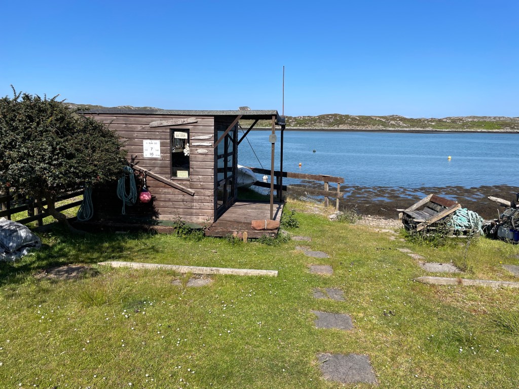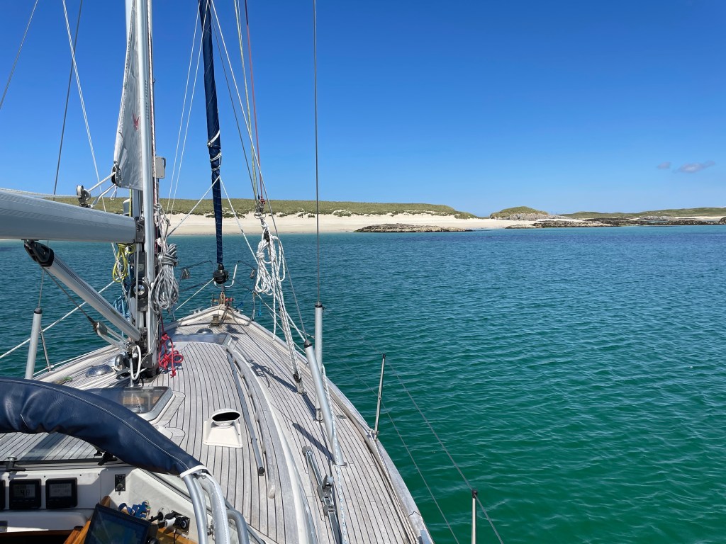 Off Ardnamurchan, we once more changed our minds as to our destination, deciding on a revisit to Arinagour at Coll, last visited on a bareboat charter a decade before, and arrived to collect the last visitor’s mooring. We enjoyed a lovely walk ashore towards the west coast of the island, before showering and a meal at the Coll Hotel, which had benefitted from massive investment since our previous visit. We were pleased to note that the garden sitting area opposite the terrace of houses on the harbour front still included a sign for ‘La Sitooterie’ – a name for our patio at home that we have used since our first visit!