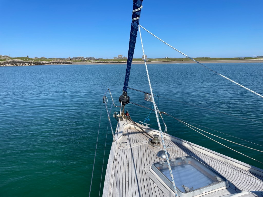 Sunday 28th May dawned grey and dull – where was that stunning weather that had been promised? We weighed anchor at a civilised time, and pressed on through the Sound of Islay with the favourable tide, passing the three distilleries on the Islay shoreline, and started to head towards Colonsay, an island we had not previously visited; en route, we realised that conditions allowed a visit to the anchorage off Oronsay, on the south end of Colonsay, which from the pilot books, appeared to be well worth a detour. Not long after we had settled on our anchor, as the only vessel in the beautiful anchorage, another yacht approached – a blue Rustler 44 with a white ensign, which could only be ‘Ballachbuie’, owned and sailed by Sir Tim Laurence and HRH Princess Anne. They chose to anchor a discrete 200m or so away from us – there was after all, bags of space!