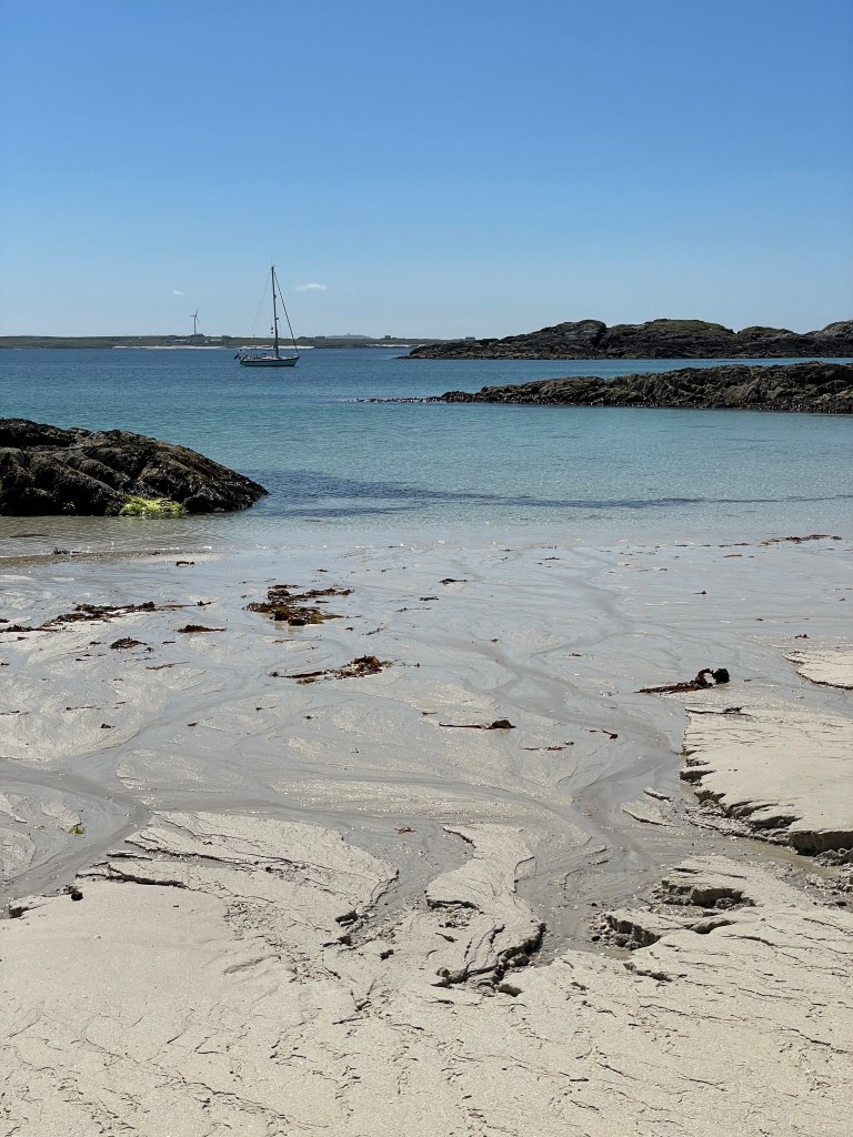 Following the photographic session, we weighed anchor and threaded our way back out of Loch Moidart; we had heard of the ‘singing sands’ beach so, with the weather being sunny and flat calm, headed south to anchor off the beach for breakfast. I rowed ashore, to walk on the squeaky sands – if you listened carefully, there was indeed a slight squeak from the sand as you walked!