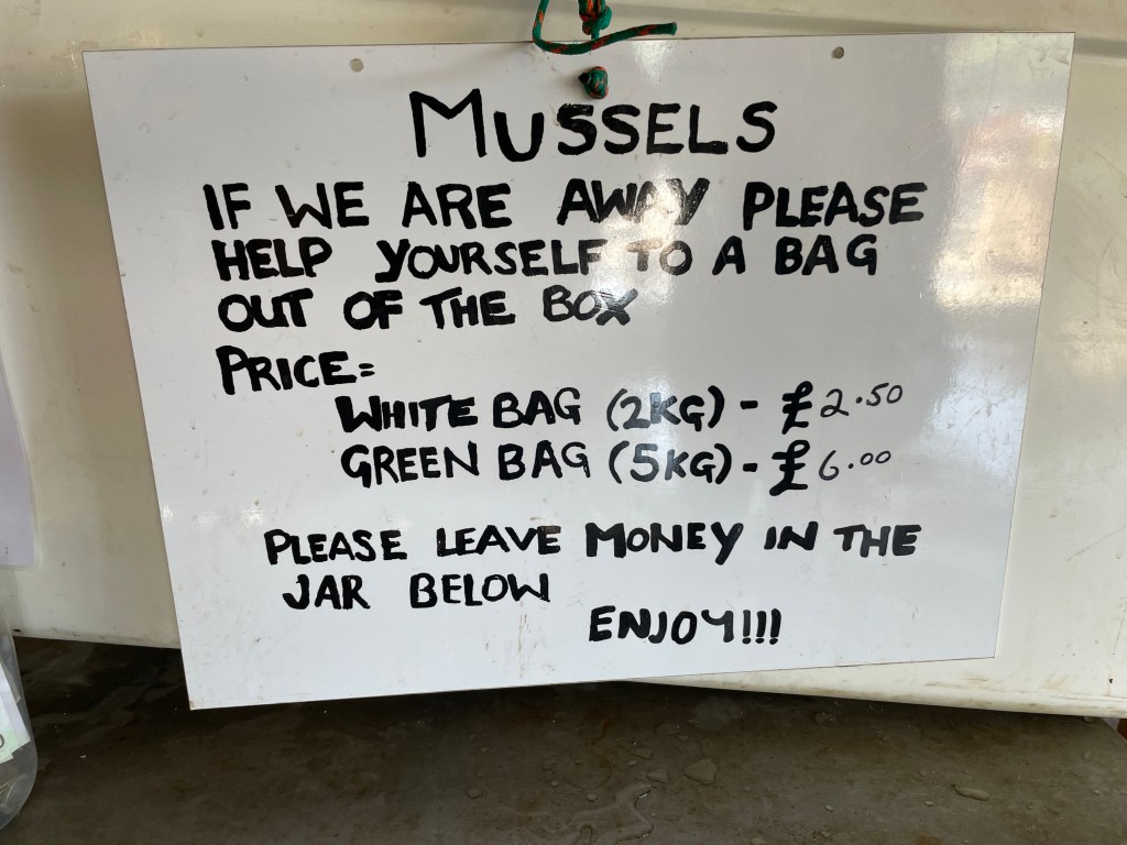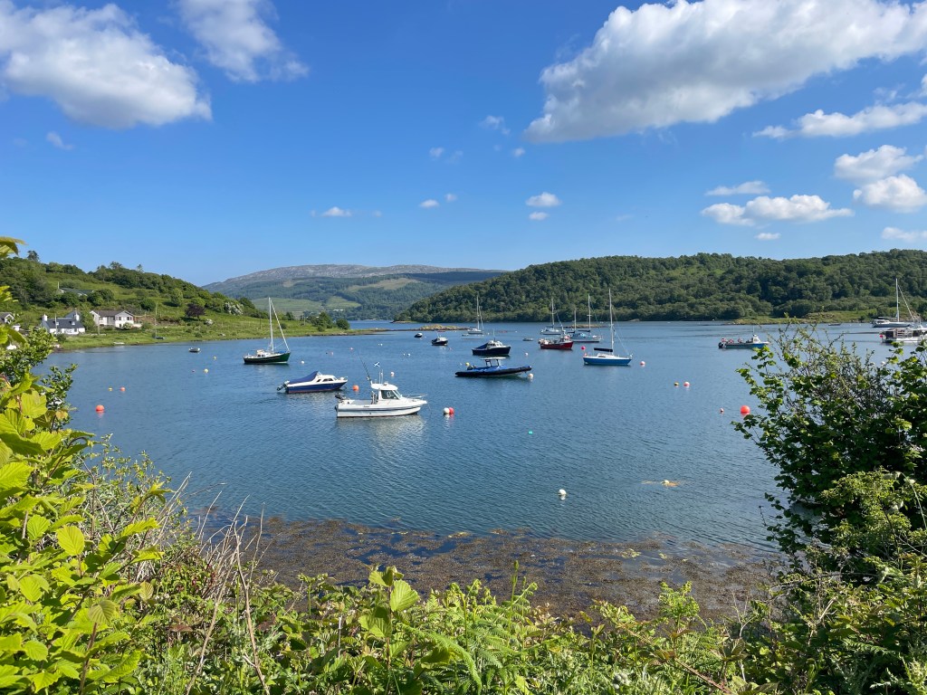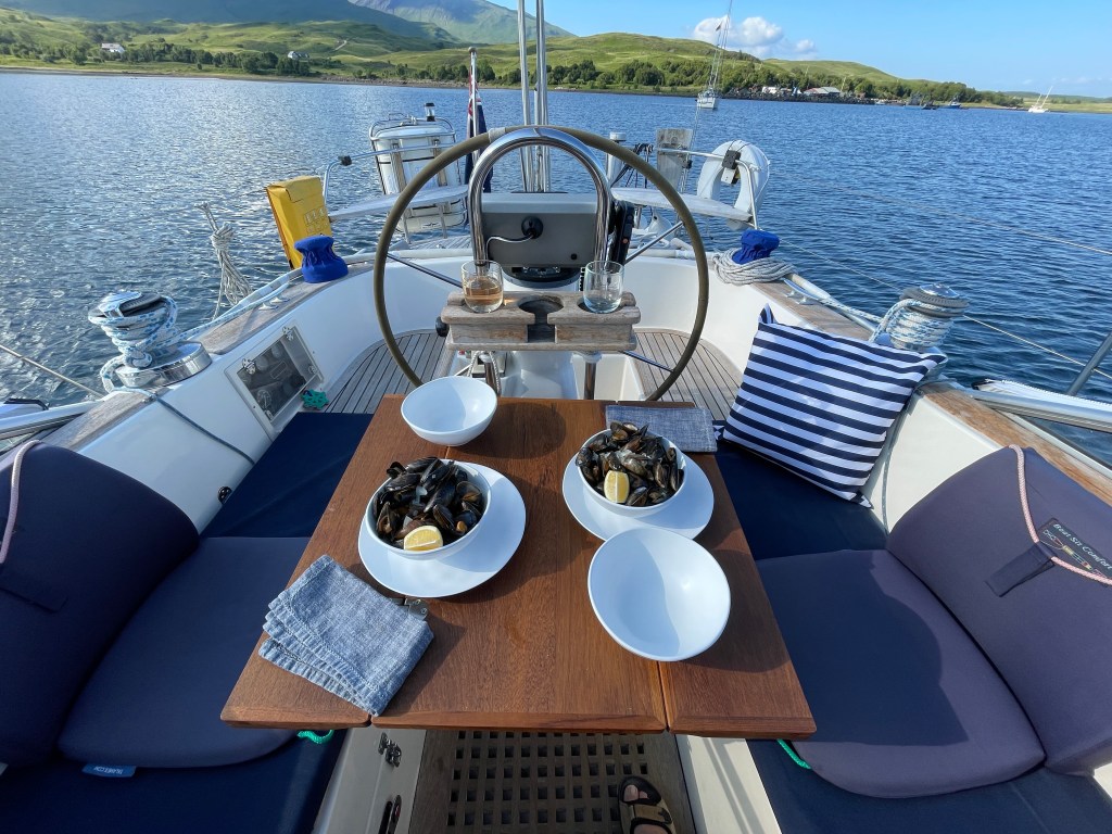 The choice from here was to sail south leaving Mull to port, or to go via the Sound of Mull; the forecast suggested that we would get a great sail if heading via the Sound of Mull, and this was certainly true – for about 2 hours, until near the Sound; the wind then dropped, and what was left was on the nose rather than behind us as expected from the forecast! Hey ho…. We headed into Loch Spelve, which we had missed on our previous cruises, and anchored near the mussel farm quay, from where we were able to help ourselves to two large bags of mussels for a fiver in the honesty box. They were truly delicious, and were on the menu for two hearty meals!