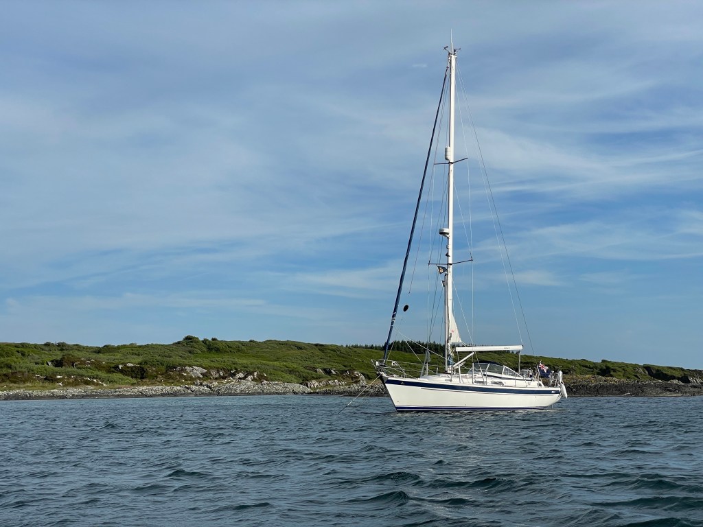 We moved onwards to the new excellent visitors moorings in Loch Staosnaig, the bay just around the corner from Scalasaig, the ‘capital’ of Colonsay, which again we had to ourselves overnight, and had a quick run ashore for a look around and some basic supplies from the Island Shop in the morning. We departed Colonsay, in sunshine and almost calm winds again, towards the Sound of Iona. We have previously visited Iona a couple of times, including anchoring in the fabulous Tinkers Hole nearby, and on this occasion, decided to pass by and head for Ulva; we enjoyed a cracking fetch from Iona across towards Ulva Ferry, which we enjoyed seeing, but instead decided to move onwards to the amazing anchorage in amongst the rocks at Cragaig Bay – open to the south but sheltered from northerlies – which on our last visit we had entirely to ourselves. On this occasion, we found there were three other yachts already present, but there was still plenty of room for us to join them.