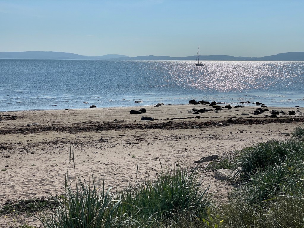 The penultimate day of our cruise offered the choice of sailing north up Kilbrannan Sound, leaving Arran to starboard, or the other way around, leaving Arran to port; it was flat calm at anchor, but the forecast was to fill in from the North East. We decided on heading to Lamlash, to anchor behind Holy Island, and after a period of motoring out of the wind shadow, we had a good sail along the south of Arran, gradually getting headed and having to aim more and more offshore; eventually, the wind had filled in with a F6 and quite unpleasant seas, but after tacking to head in towards Lamlash Bay, we were soon anchoring in still conditions near the Buddhist retreat on Holy Island. Before long, and for the first time in nearly 12 months, the over-boom sun awning had to be given its airing to provide shade from the overly hot sun.