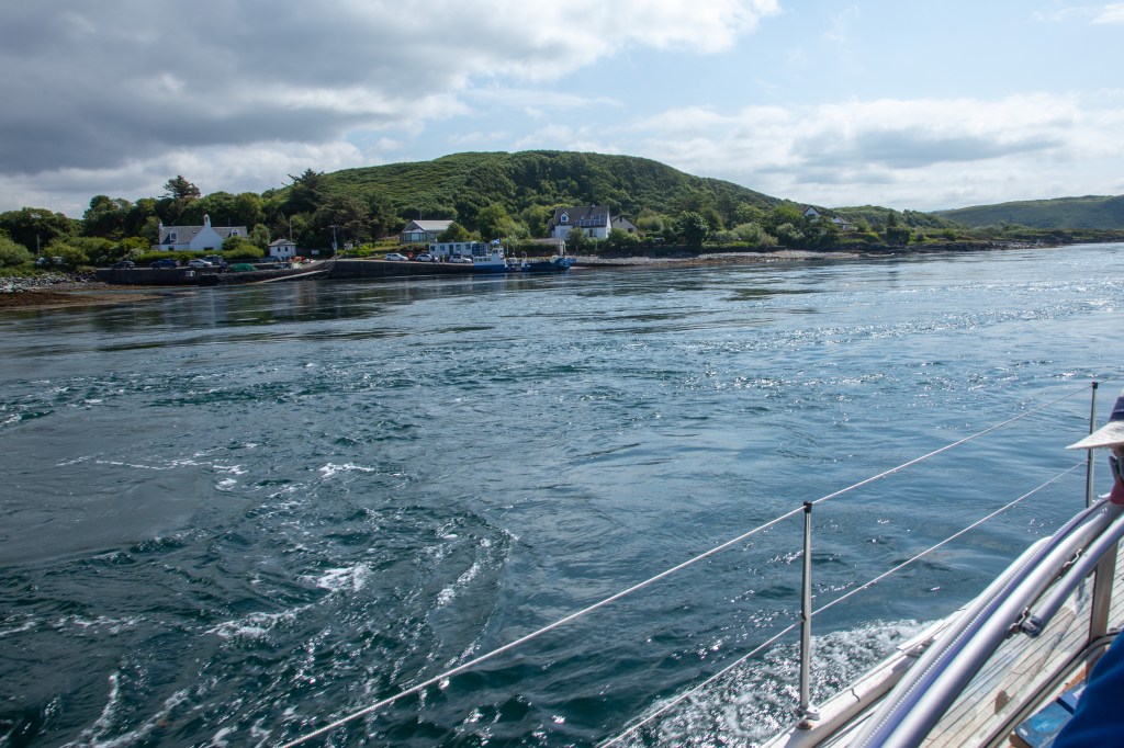 The next day presented us with tidal gates at both the entrance to Loch Spelve, and to go through the Sound of Cuan, as we needed a pit stop at Craob Marina for water and fuel. We had hoped to sail through the Sound but the wind was a bit too feeble, again; whilst we know the air draft of our HR36 left plenty of margin under the HV power cables across the sound, it does look interestingly close! We whistled through the Sound with the currents swirling around, assisted again by the great Antares chart showing the detail of the rocks and the line to take at the corner of the Sound.