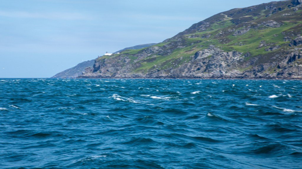 Consequently, next morning we started at a civilised time, with another blue sky day and light airs from the NW; the sunshine lasted until about a mile before the Mull of Kintyre lighthouse, with the west facing coast here in cloud – the cloud was almost solid to the west, too.